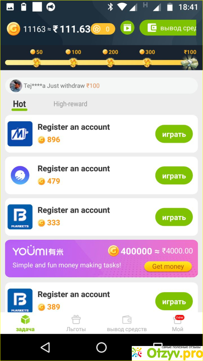 Чтобы заработать, требуется скачивать через Make money приложения с разных источников, регистрироваться в них или играть по нескольку минут, зависит от поставленного задания.