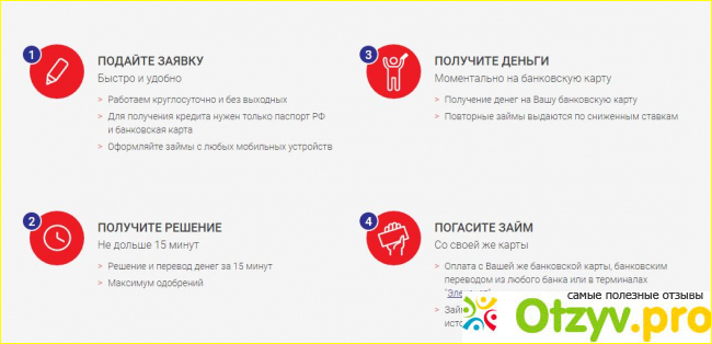У данной финансовой структуры имеются определенные преимущества и удобства, которые они предоставляют для своих клиентам. Прежде всего преимуществом является, что вся заявка выполняется онлайн-способом и нет необходимости посещать отделение организации. Подать запрос на заём денежных средств можно из личного кабинета. Деньги придут к вам на банковскую карту в течении 15-20 минут с момента оформления и одобрения вашей заявки. При этом данное время на оформление рассмотрения заявки уходит только при первом оформлении кредита. В дальнейшем это время будет занимать не более 5 минут. Так что потом получение кредита будет происходить гораздо быстрее. В личный кабинет можно входить, не придумывая постоянный пароль. Всё делается только при помощи номера телефона, который будет в дальнейшем привязан к вашему кабинету. Своевременная выплата всех кредитов будет хорошо влиять на вашу кредитную историю и улучшать её. Эта микрокредитная организация позволяет вам получать заём в любом месте, где бы вы ни находились. Главное, чтобы у вас было под рукой устройство для входа в личный кабинет и стабильное интернет-соединение. При первоначальном оформлении понадобятся паспортные данные и сама банковская карта.