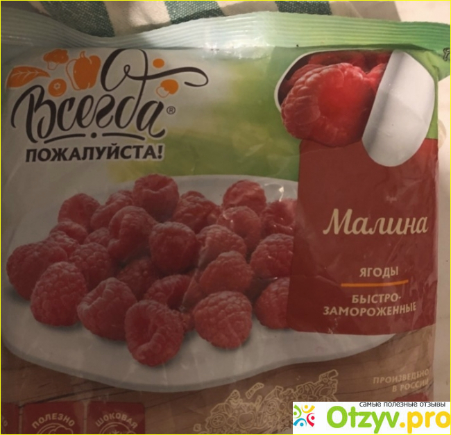 Между прочим малина является природным антидепрессантом. Поэтому я стараюсь использовать эти ягоды для питания своей семьи как можно чаще, особенно в период зимне-осенних обострений вирусных заболеваний, так как малина лучший помощник от простуды. Пакет быстрозамороженной малины фирмы Всегда пожалуйста весит 300 грамм. Цена недешевая. Упаковка красивая, яркая. И хотя в замороженной ягоде снижается содержание витаминов, но значительное их количество все- таки сохраняется.