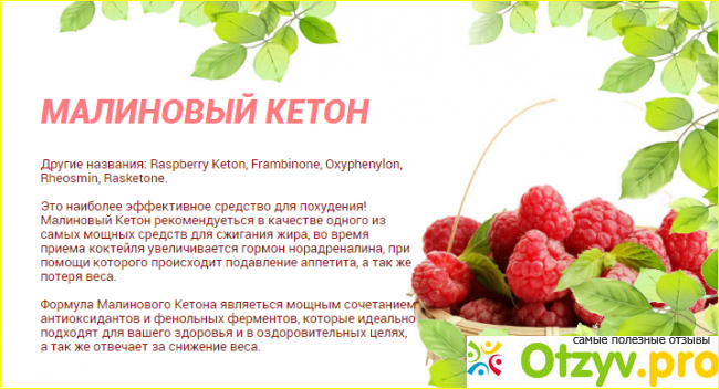 «Что может быть лучше, чем помощь самой природы. Основной компонент добавки для похудения – малиновый кетон, то есть натуральный жиросжигатель. Он безопасен и одновременно эффективен, так что исправить показания весов можно будет без вреда для здоровья и ущерба самочувствию. А заодно можно деликатно прочистить кишечник и всю систему ЖКТ, выгнав застоявшийся мусор в виде токсинов и шлаков. Всего пара коктейлей в день или несколько конфет перед едой и тело в порядке, и здоровье на высоте».