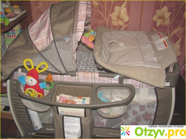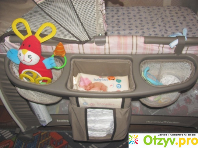 Есть электронный блок с ночной подсветкой, вибрацией и музыкой и к нему есть возможность подключить мр3 плеер! Прекрасный органайзер в который вы можете вместить вс необходимое, чтобы было удобно в использовании. Еще есть пеленальный столик который по возможности можно или же поднять его когдапереодеваете своего ребеночка или же опустить. На пеленальном столике есть ремни безопасности, возможно дома никого нет а вам нужно срочно отойти , то вы без всякогостраха спокойно пристегиваете ребеночка ремнями а сами идете в другую комнату. Тут же есть и карусель игрушечная механическая(играетспокойная ненадоедливая музыка). Огромнейший органайзер в который вмещается большое количество необходимых вещей и памперсов))Пока ребеночек маленький нижний ярус можно использовать как комод в который можно положить или же игрушки или же вещи))