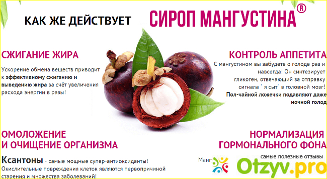 Сироп мангустина является поистине уникальным средством для похудения, в состав которых входят только натуральные компоненты. Как обещает производитель, на протяжении тридцати дней вы сможете потерять до пятнадцати килограммов лишнегно веса.