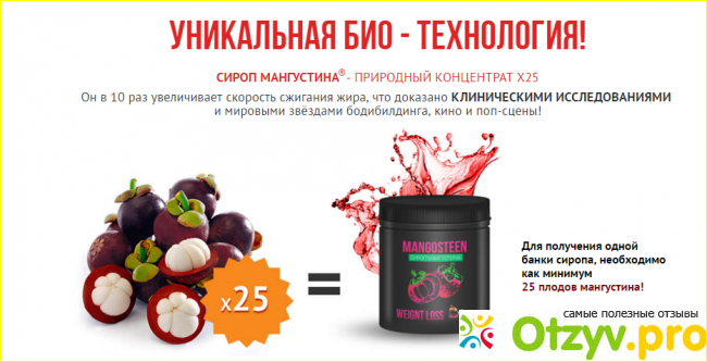 Мангустин – это достаточно вкусный фрукт, который обладает невероятным вкусом, но не обладает никаким запахом. Данный фрукт включает в себе невероятное количество витаминов, так же в нем содержится не мало необходимых для организма веществ, а так же в нем есть высокое содержание ксантонов. В сиропе содержится достаточно большая концентрация фрукта мангустина, регулярно применяя препарат, получается быстро избавиться от лишнего веса, при этом сироп не вызывает негативных последствий, аллергии, или же побочных действий.