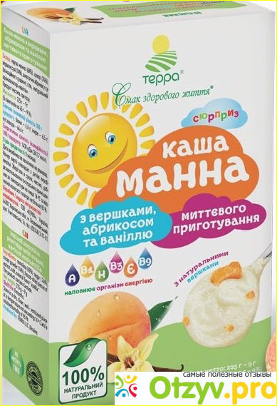 Хочу рассказать о замечательной манной каше с фруктами мгновенного приготовления "Терра", которая понравится и детям, и взрослым. Есть два вида такой каши - с малиной и сливками, и со сливками, абрикосом, ванилью. Это единственная торговая марка, которая предлагает манную кашу быстрого приготовления.