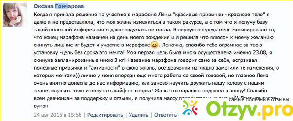 Я пересмотрела большое количество отзывов тех, кто худел по марафону. Я смотрела видео-отзывы на ЮТУБЕ. На этом канале нет ссылок на конкретных людей, но я начала воодить по именам в поиске в социальной сети ВКОНТАКТе, и оказалось, что это не актеры, не придуманные люди, а вполне реальные. Ну и непосредственно я начала общаться с этими похудевшими женщинами и девушками, которые только подтвердили результат и присылали мне фото свои до и после похудения. Это все меня впечатлило!