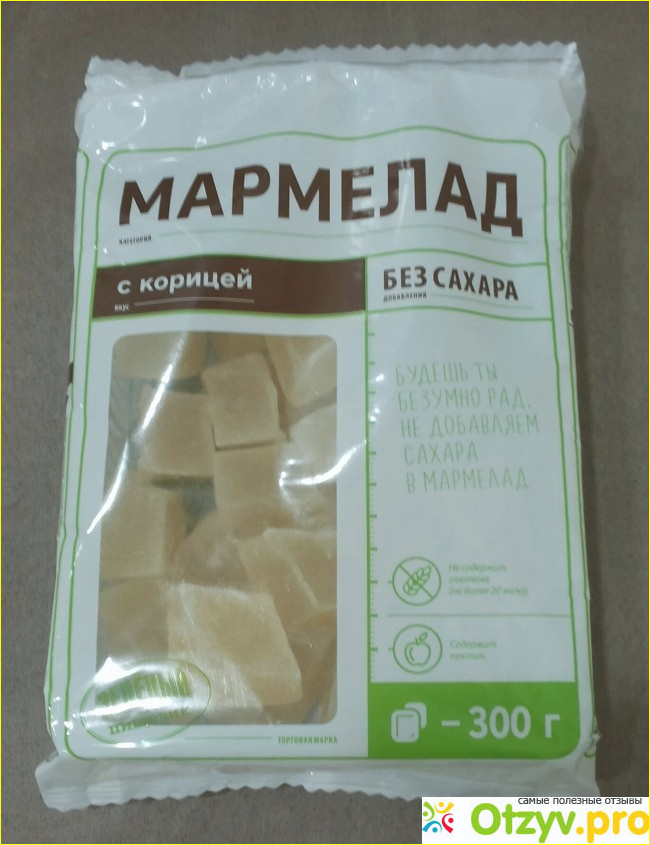 В упаковке идет триста грамм мармелада. На упаковке так же указано, что продукт не содержит глютен (дань моде, я так понимаю, потому что в обычном мармеладе тоже нет глютена), и содержит пектин, который полезен для нашего организма.