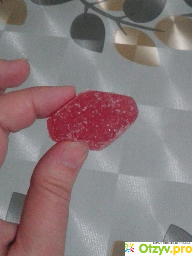 Мармелад уложен в пластиковый контейнер, который запакован в пакетик. Каждая мармеладинка имеет стандартную форму и обсыпана сахаром - и это тоже напоминает детство. Сахара гораздо меньше, чем в давние времена, но для меня это плюс: меньше скрипит на зубах. еще одним важным плюсом является то, что мармелад не липнет к зубам.
