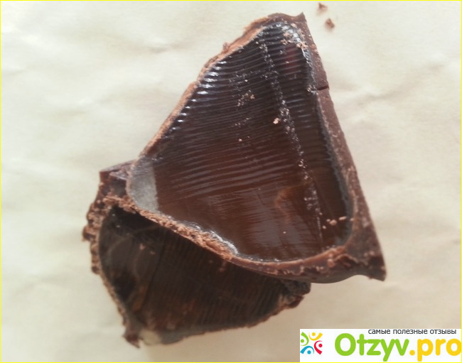И вкус у него отличный. Вот как он выглядит на срезе: тонкая шоколадная глазурь и аппетитный мармелад.