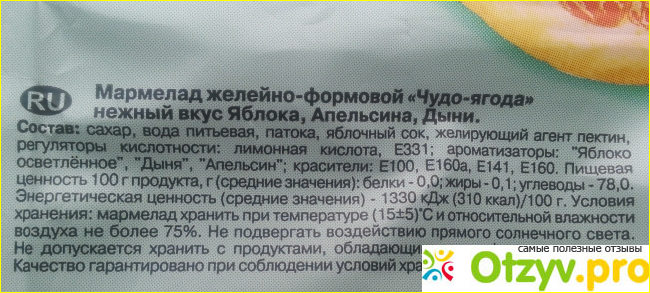 Как видим, в мармеладе есть и красители, и ароматизаторы. Самое ценное здесь – натуральный яблочный сок и пектин.