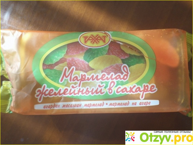 Мне нравится этот мягкий мармелад из Казахстана, на упаковке написано, что это мармелад на агаре. Между прочим агар является заменителем желатина и добывают его из водорослей, то есть агар - это продукт растительного происхождения, в то время как желатин у нас животный продукт. Поэтому использовать агар предпочтительнее. Агар-агар имеет ноль калорий, что уже несомненный плюс для мармелада. Однако наш мармелад посыпан сахаром, что повышает калорийность.