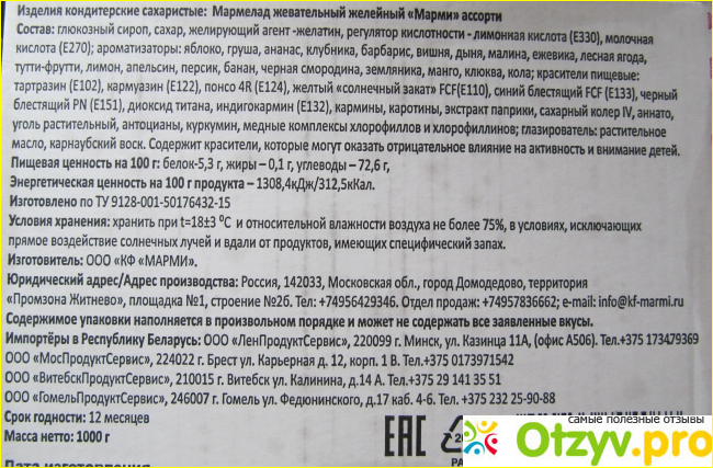 Состав жевательного желейного мармелада "Марми" ассорти поверг меня в шок. В нем столько, далеко не натуральных, красителей, которые - цитирую: "могут оказать отрицательное влияние на активность и внимание детей".