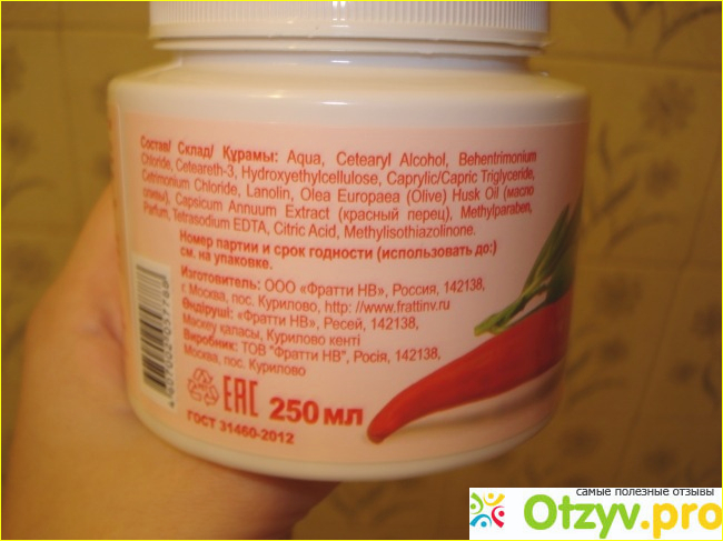 Вся информация о продукте предоставлена на самой банке. Производится маска в Подмосковье. Объем, как я уже писала ранее, 250 мл. В состав входят экстракт красного перца и масло оливы. В целом, как по мне, состав страшноват, химии там довольно много, ни о какой натуральности тут речь не идет.