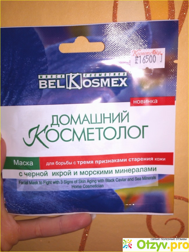 Это была маска из серии "Домашний косметолог" для борьбы с тремя признаками старения кожи с чёрной икрой и морскими минералами. Вот так выглядит упаковка данного продукта.