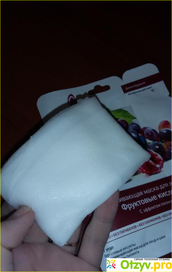 У меня сухая кожа, которая к вечеру обычно становится уставшей. Именно в этот период я и люблю устраивать различные процедуры красоты, чтобы поддерживать тонус и упругость. Маска с фруктами привлекла прежде всего приятным описанием и конечно ценой. Использование традиционно. Слегка мну саше, открываю, и извлекаю лекало. Оно здесь довольно причудливое и просто огромное. Я не знаю, под какие размеры лиц кроили данную масочку, но она даже для мужчин с внушительными подбородками будет велика.