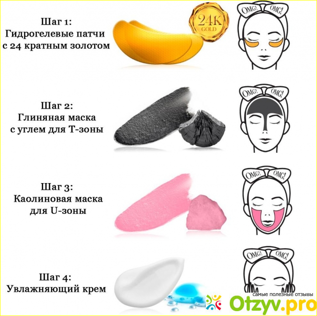Итак, продукт представляет собой четыре саше объединенных в одно. Это 4 шага по уходу за лицом и четыре разных средства. 1 это патчи для кожи вокруг глаз с 24-х каратным золотом. Предназначены против отеков, для придания упругости кожи и так далее. 2 - это глиняная маска для ухода за Т-зоной. Она оказывает очищающее действие, избавляет от жирности и черных точек. 3 - каолиновая маска, которая наносится на все остальное лицо. Она очень хороша при сухости, выравнивает тон и придает упругости.