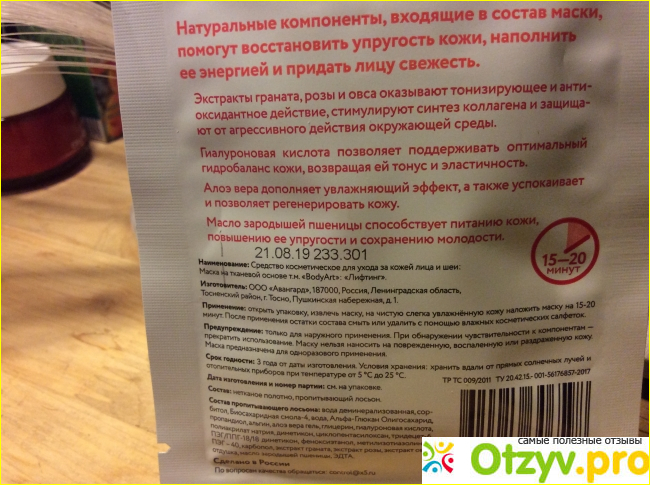 В состав маски для лица лифтинг Bodyart входят натуральные компоненты которые помогают восстановить цвет лица, удалить мелкие морщинки сделать кожу лица более эластичной и упругой. В составе маски есть гиалуроновая кислота, прекрасный компонент позволяющий подтянуть кожу лица. Алоэ вера успокаивает кожу лица и хороший антисептик. В составе присутствуют экстракты овса, он хорошо питает и успокаивает кожу, розы и граната. Так же есть и химические компоненты, но они присутствуют как правило во всех косметических средствах.