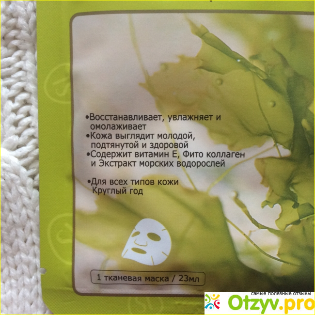 Чем же удобны тканевые маски? Во-первых, они нужны для единоразового применения, удобны в хранении и максимально просты в использовании, ведь они не подразумевает сложности в несении, распределении и смывании. Все серии этого производителя тканевых масок подразделяются не только основными активными компонентами, ну и цветами упаковок. Эта маска с коллагеном и морскими водорослями имеет цвет упаковки нежно-зелёный, приятный оттенок. Он располагает к тому, чтобы его запомнили и после быстро нашли на полках магазинах.