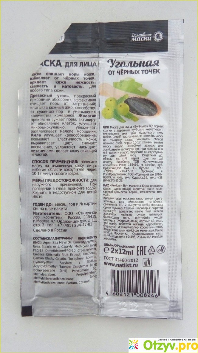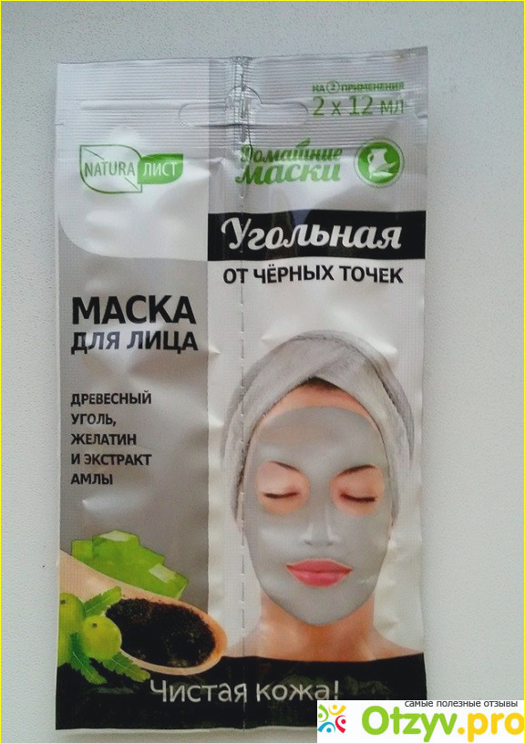 Маска содержит черный древесный уголь, желатин, экстракт амлы. У меня два пакетика по 12 мл. Одного такого пакетика хватает на одно применение. Цена ее была на момент покупки около 30 рублей вроде бы. Не дорого считаю вообще!