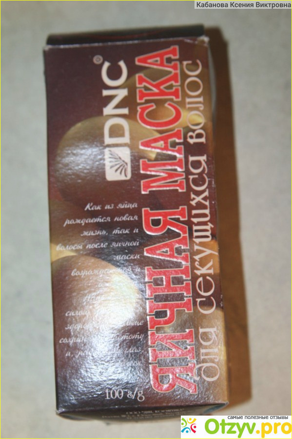 Продается яичная маска в довольно внушительной коробочке темно-коричневого цвета. В принципе оформление средств у этого производителя практически везде одинаковое. На упаковке крупными буквами написано название торговой марки средства, а чуть ниже буквами по меньше написано, что эта маска яичная. А еще ниже можно прочитать для каких волос средство рекомендовано использовать.