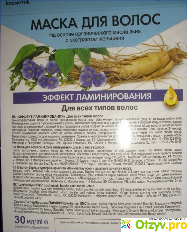 Протестируем данную косметику для волос. Данная маска продавалась в картонной упаковке, прямоугольной формы, достаточно плоская по размерам. Упаковка выглядит ярко, красиво, внешне привлекает внимание покупателя. На лицевой стороне упаковки написано название, что данная маска подходит для всех типов волос, что создана она на основе огранического масла льна с экстрактом женьшеня, и то, что она создает эффект ламинирования волосам. на тыльной стороне написана вся необходимая информация, о составе маски, способе применения ее, и мерах предосторожности.