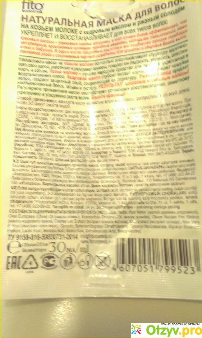 На обороте мелким шрифтом представлена прочая информация о маске: полный состав, способ применения и так далее.