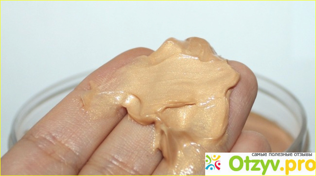 Консистенция - это самое запоминающееся и оригинальное в данной маске. Она очень густая, кремообразная, бежевого оттенка. В ней много мелких золотистых частичек. Честно говоря, при покупке я этого вообще не заметила, но когда открыла баночку, восхитилась. Визуально очень привлекательна.