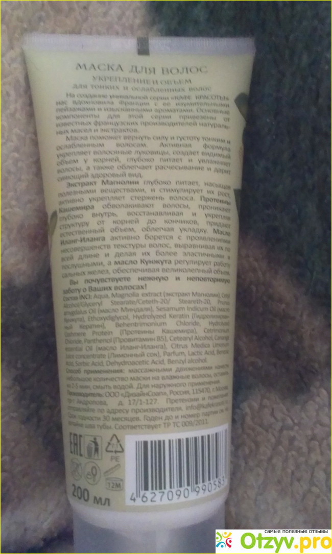 Коробочка в ней симпатичный тюбик с маской. Оформление очень симпатичное, нежные расцветки с цветами магнолии. Объём 200 мл. Много информации о составе содержится на самом тюбике плюс дублируется на коробке, подробно описываются полезные свойства для волос основных компонентов состава маски. Заявлено, что маска на 97,2% состоит из натуральных компонентов. Очень хороший состав, самые полезные экстракты и масла в самом начале списка. Кератин, кашемир, про витамин В 5 всё для лучшее для преображения волос.
