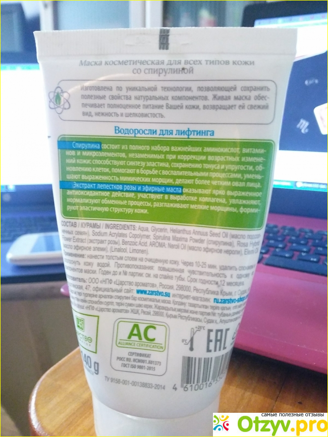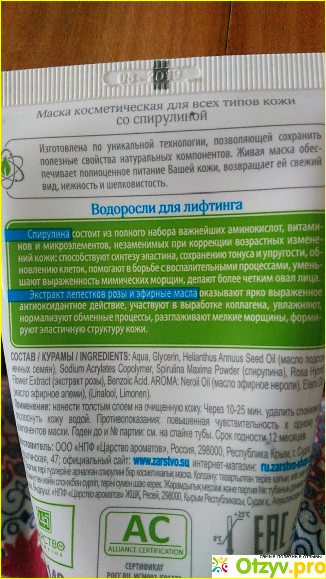 Маска со спирулиной не имеет особенного аромата, присутствует запах растений, но он достаточно быстро улетучивается.