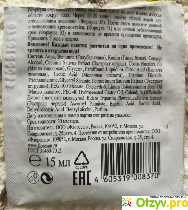 Продается такая маска либо поштучно, тогда стоимость пакетика около десяти рублей, либо пачкой, в ней десять пакетиков по 5 грамм. Этого вполне достаточно даже для двоих.