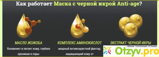 В маске Anti Age сохранены все полезные свойства основного ингредиента, что удается далеко не всем производителям косметики с черной икрой. Бережная обработка осуществляется методом холодного эмульгирования. В составе присутствуют очень мелкие частицы, которые проникают в глубокие слои кожи, что дает усиленный эффект от использования Маски с черной икрой.