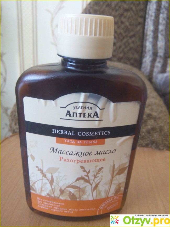 Очень хорошего качества массажное масло от Зеленой аптеки -разогревающее. Буквально небольшое количество масла нужно для нанесения на спину (лучше его немного перед этим подогреть). Через несколько минут после начала массажа кожа становиться красной и по телу идет приятное тепло. В составе присутствуют эфирные масла, такие как апельсиновое, корицы и черного перца. После того как массаж закончился тело еще теплое в течении часа ( я лежу под одеялом и балдею). очень приятный аромат масел, такоеблагоуханиестоит поле массажа. Полностью натуральные масла без красителей и консервантов, считаю это огромным плюсом для производителя, так как масла проникают в нашу кожу через поры и не хотелось бы, чтобы это была химия. Есть у данного массажного масла небольшие минусы -это то, что остаются следы после массажа на одежде, поэтому после массажа нужно хорошо помыть кожу, чтобы не испачкать белье и одежду. По поводцу ценовой политики, то и тут все нормально, средство достаточно бюджетный вариант.