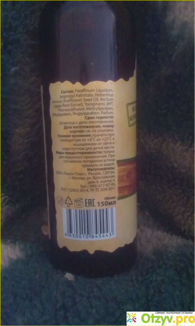 Масло находится в небольшой бутылочке с распылителем. Сразу скажу распылять масло не совсем удобно. Объём 150 мл. Изготовлено по Госту. Имеется много завлекающих надписей о натуральности и качестве масла, а так же о его воздействии на волосы. В процессе ознакомления с составом масла и после нескольких применений, я лично убедилась, что верить всему, что пишет производитель не стоит совершенно.