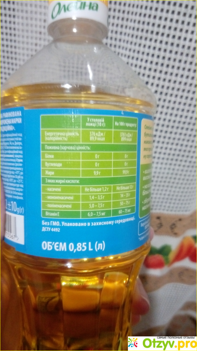 На бутылке есть наклейка, на которой производитель указывает всю необходимую информацию о данном продукте: состав, энергетическую ценность, контакты производителя. Возле горлышка выбита дата производства масла.