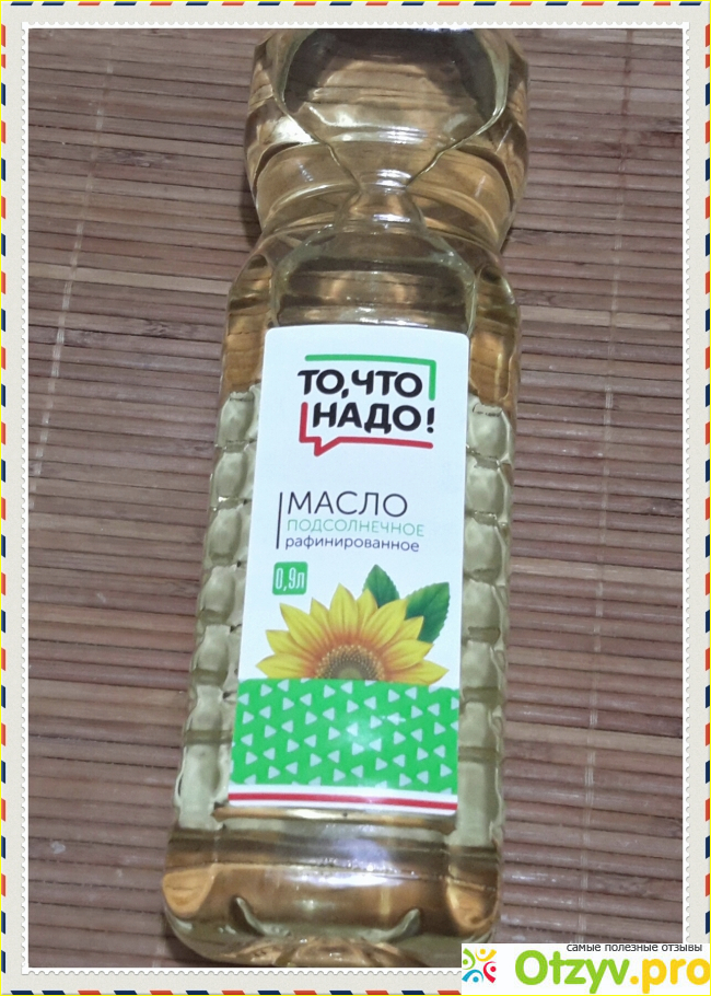 И в этот раз, я решила купить подсолнечное маслице под торговой маркой: "То, что надо!"Такая продукция продаётся в супермаркетах торговой сети "Окей" и отличается от других брендов более доступной стоимостью. И действительно, на момент моей покупки такое масло стоило около 50 рублей. Это самая обычная прозрачная стандартная пластиковая бутылка, закрытая крышечкой в зеленом цвете. Бутылка имеет полу квадратную форму, и напротив друг друга, на её сторонах наклеена пара этикеток.