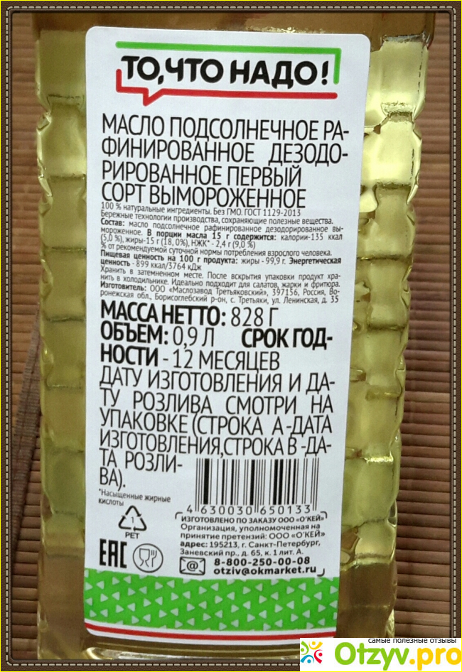 На одной из таких этикеток можно прочитать информацию об этом маслице. Относится оно к первому сорту, масло это рафинированное, дезодорированное, вымороженное, 100 процентное, подсолнечное. И изготовлено оно в нашей стране, в Воронежской области, специально по заказу ООО"Окей".