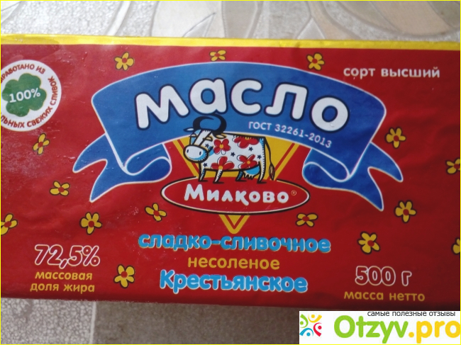 Сегодняшний отзыв пишу о масле. Это сладко-сливочное крестьянское масло "Милково" (несолёное), жирность составляет 72,5%. Упаковки обычно я покупаю немаленькие, поэтому обратила внимание на это масло, вес продукта 500 граммов.