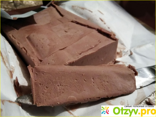 Пахнет ванилью и выпечкой, как вафелька от мороженого, такое ощущение. Режется легко, не крошится. Хотя было замороженное. Однородное по консистенции, но матовое по цвету, хотя по указанному ГОСТ 32899-2014 должно быть блестящим, а также какао 2,5%, сахарозы 15% (таблица 2). Но в составе указан сахар, хотя можно и без него или со сниженной калорийностью изготавливать (таблица 3, пункт «подсластители»). Это вкусовой компонент по пункту 5.2.2.2.