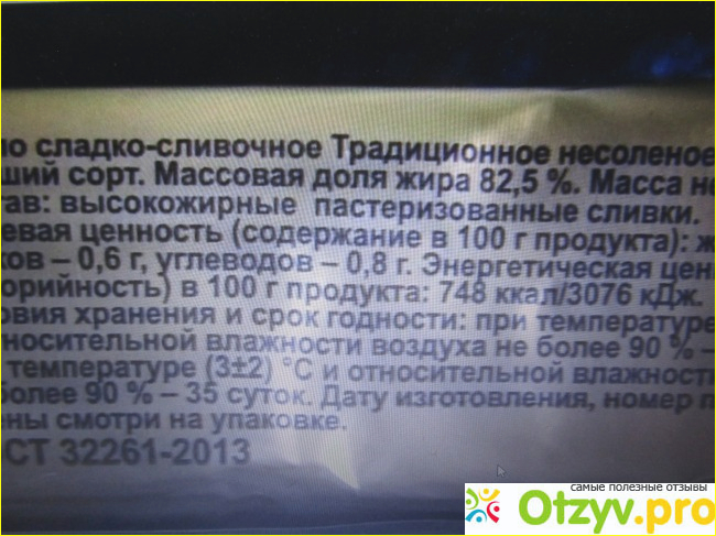 Герой моего отзыва имеет оптимальную на мой взгляд жирность - 82,5%. В составе нет соли (для меня это явное достоинство, к соли я отношусь настороженно и стараюсь употреблять ее по минимуму. Стоит чуть перебрать с ней, на следующий день умираю от головной боли). В пачке находится стандартное на сегодняшний день количество продукта - 180 грамм. Сделано по ГОСТу (я всегда выбираю молочную продукцию, сделанную исключительно по ГОСТу, как правило, такие продукты оказываются если не замечательными, то хотя бы съедобными).
