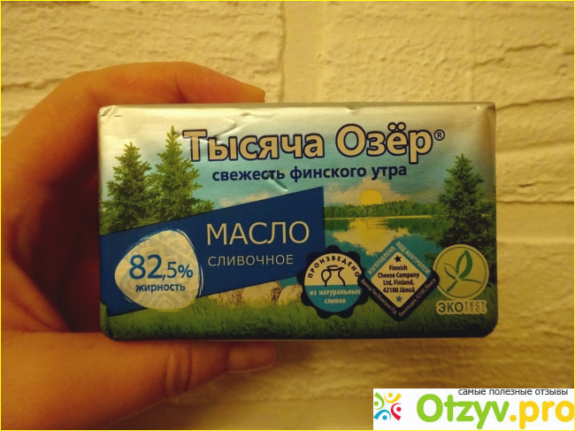 Масло «Тысяча озёр» изготовлено по ГОСТу отечественным производителем ООО "Невские Сыры" в лучших финских традициях из натуральных, пастеризованных сливок. Сливочное масло содержит сбалансированный набор полезных ингредиентов (жиров, аминокислот и витаминов). Рекомендованная суточная доза масла имеет вес - 20 граммов.