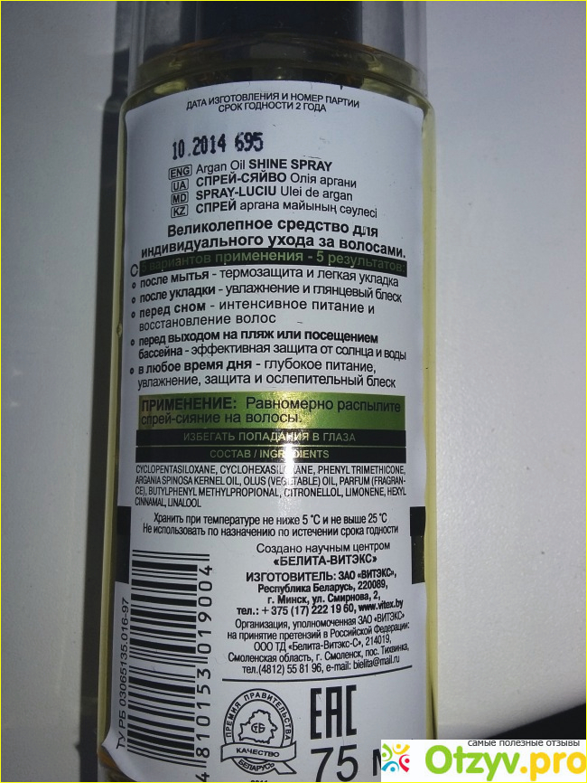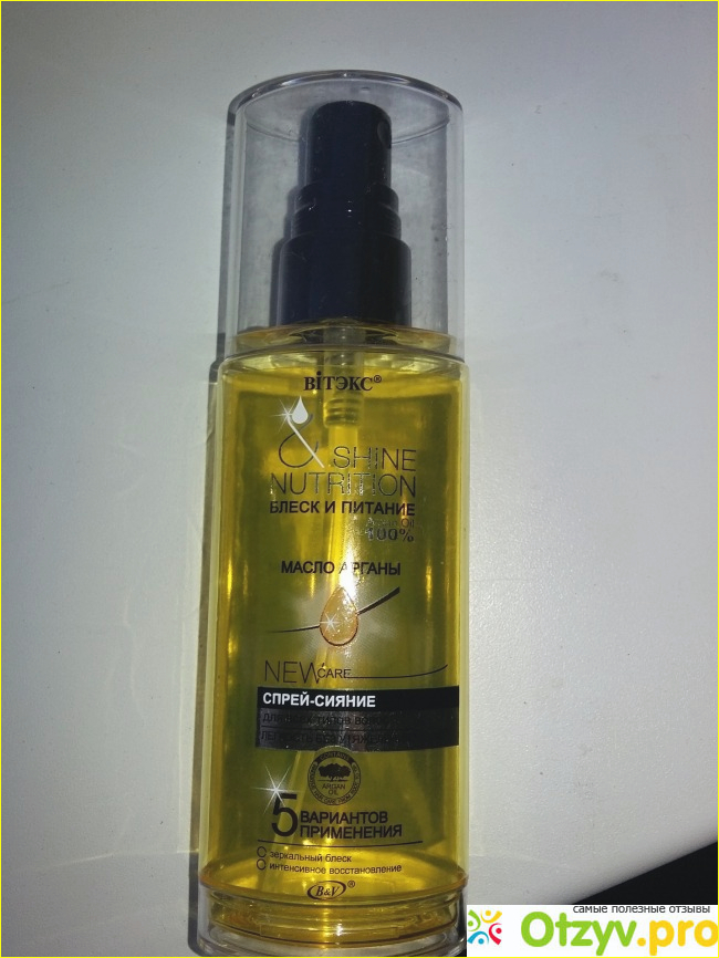Я очень часто крашу свои волосы и через некоторое время волосы становятся безжизненными. Решила купить масло спрей для волос фирмы Витекс. Масло спрей с маслом арганы имеет очень приятный аромат который долго остается на волосах. Применяла после душа, иногда просто наносила на волосы, чтобы был блеск и затем прочесывала расческой. Само масло легкое, наносится как вода, удобно тем , что есть пульвелизатор. Не оставляет жирного блеска, распыляется равномерно. Применять можно как вам удобно. Можно перед сном нанести на волосы или после того как помыли волосы. Флакон 75 мл. и стоит около 200 рублей. Изготовитель: Республика Беларусь.Флакон маленький и удобный и поэтому можно носить с собой в сумке. Через месяц заметила, что волосы стали мягкими, более крепкими и живыми. Результат был отличным. Секущих волос стало намного меньше. А самое главное то, что я заметила отсутствие волос на расческе, как это было до применения. Масло очень понравилось и хватило на месяц. Мне очень понравилось. Пойду за вторым флаконом. Советую попробовать тем, у кого появились проблемы с волосами.