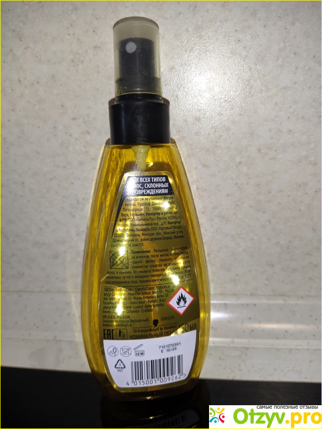 Недавно встретила продукт, сочетающий в себе обе эти функции и решила его опробовать. Это средство называется масло-спрей "Термозащита" от фирмы Gliss Kur. Мне сразу понравилось как классно оформлена упаковка - красивый золотистый флакончик привлекает внимание покупателя.