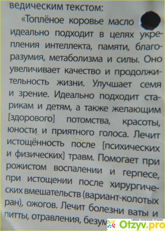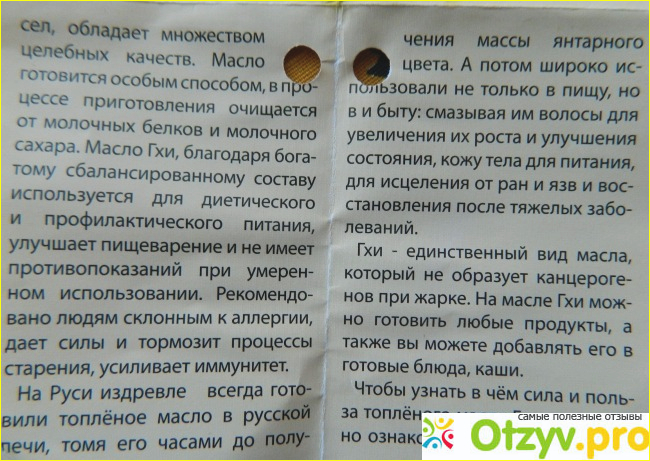 Ну а о том, чем полезно приготовленное по традиционным аюрведическим рецептам масло гхи подробно написано на привязанной к горлышку банки буклете- раскладушке.