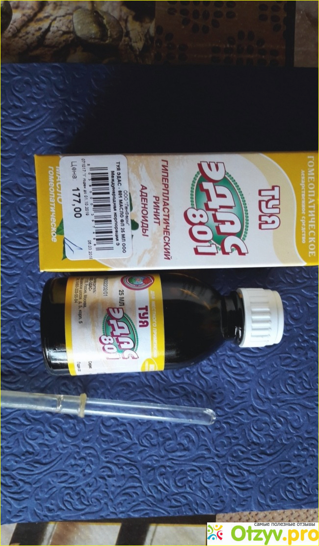 Обратились к лору. Врач посоветовала промывать носик теплой водичкой с морской солью Ну, это мы и раньше делали. А еще порекомендовала Тую Эдас 801. Решили попробовать. Тем более, что этот препарат свободно продается в любой аптеке и стоит недорого.