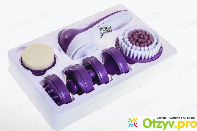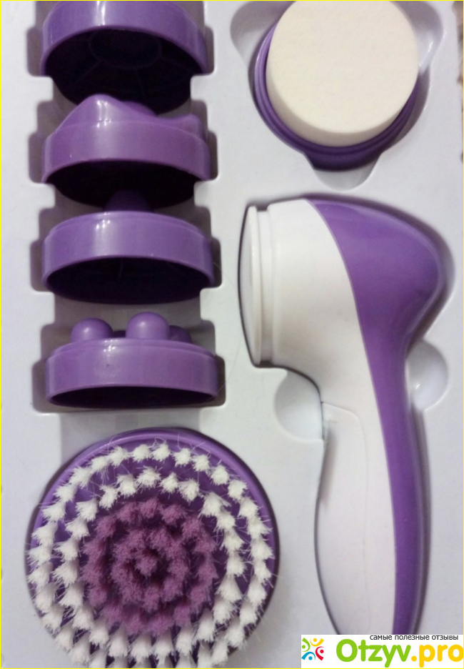 В комплекте по мимо основного блока массажера еще прилагается шесть насадок. И каждая из таких насадок выполняет строго отведенную функцию. Первая и самая популярная насадка в этом приборе - это щеточка. Она предназначена для умывания с помощью специального средства. Производитель советует использовать такую насадку каждый день. Но на самом деле это грубейшая ошибка. Так как с помощью щеточки вы будете осуществлять механический пилинг. В процессе этой процедуры будут с кожи уходить огрубевшие частички. Эта процедура полезная если ее выполнять один раз в неделю, но не чаще.