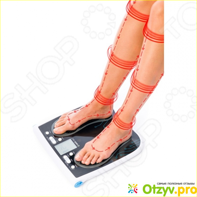 Сам прибор представляет довольно интересную конструкцию. Массажер состоит из подставки для ног. На данной подставки находятся кнопки управления и электронный дисплей. Для каждый стопы есть строго отмеченное место. Также на подставке с обратной стороны есть специальные механизм. которые позволяет устанавливать ее на ровной поверхности под разным углом наклона. Благодаря этому массажер можно удобно подстроить под различное положение тела.
