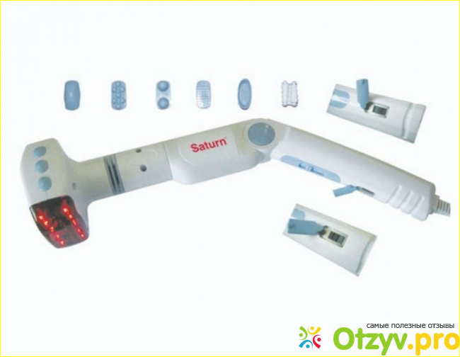 Массажер Saturn - это прибор вибрационного типа, имеющий шесть сменных насадок и оснащенный инфракрасным излучением. Именно этот, глубоко проникающий инфракрасный свет, оказывает лечебное воздействие при насморке, гайморите, а также используется для лечения гематом, венозной сетки и купероза.