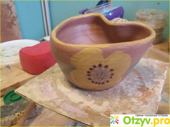 Все свои изделия можно забрать через месяц после проведения мастер-класса. Работы учеников отправляют на обжиг, за отдельную плату изделия могут покрыть стеклянной глазурью. Горшки покрытые глазурью гладкие и блестящие, а горшки которые не покрывают глазурью шершавые. Их все равно можно использовать по назначению. К сожалению с горшками обращаются не очень аккуратно, обнаружено несколько сколов, возможно они образовались при транспортировке горшков в Центр активного движения после обжига. Стоит учитывать, что горшки хрупкие и взять с собой коробки и бумагу, чтобы довезти горшки до дома в целости и сохранности.