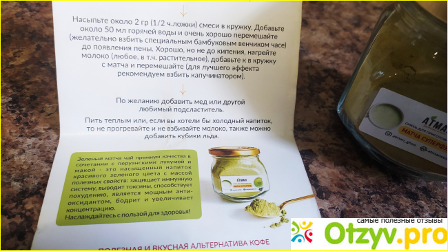 Подруга натолкнула меня переходить от обычного чая и кофе на зеленый чай матча, мол, это способствует похудению. Я сразу скажу, что никакого эффекта похудения я не ожидала и, как показала практика, не ошиблась. В интернете и в описании на упаковке заявлено, что этот чай способствует детоксикации организма, выводу вредных элементов, ускорению метаболизма и жиросжиганию.