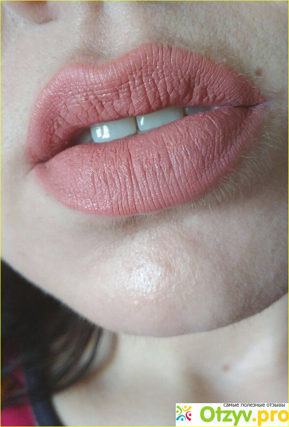 Помада очень кремовая, нежнейшая. Наносится очень легко и удобно, можно даже не применять карандаш. После нанесения нужно подождать пару минут, помада засохнет и станет матовой. По-сравнению со многими другими матовыми помада - эта губы не сушит и не стягивает. Но если вы знаете, что у вас есть проблема сухости губ, все-таки рекомендую дополнительно пользоваться бальзамом или гигиеничкой, чтобы не усугубить ситуацию. Данный продукт не липкий, легко можно поправлять в течение дня.