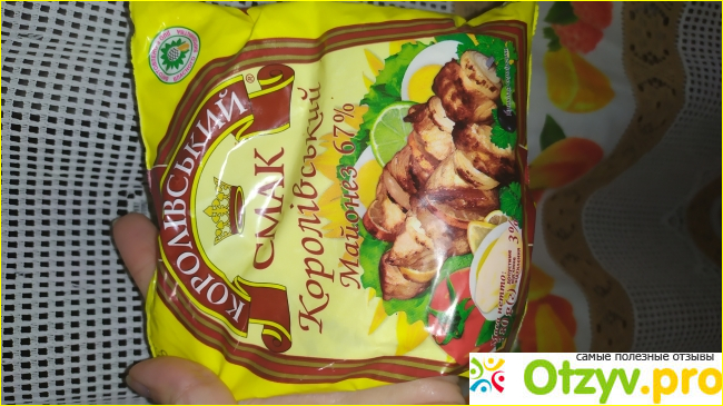 Сегодня я готовлю салатик с крабовыми палочками и сыром и для его заправки купила майонез от производителя Королевский смак "Королевский". Жирность этого майонеза 67%.